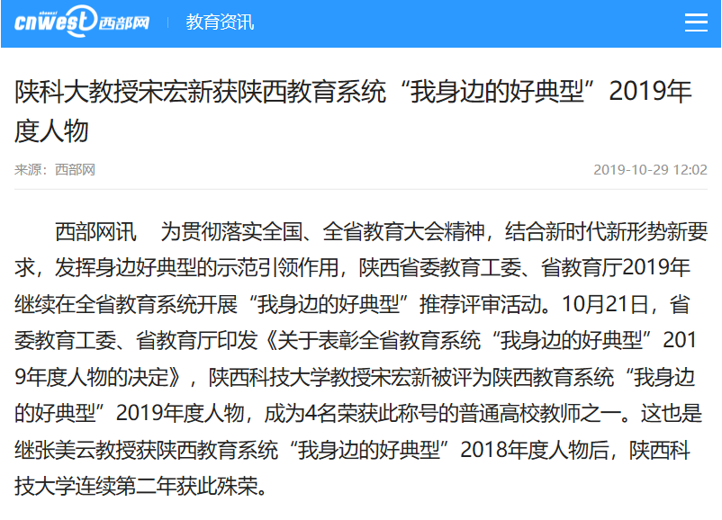 10月29日,《西部网》报道了pg电子官网教师宋宏新教授获陕西教育系统“我身边的好典型”2019年度人物,全文链接如下:http://m.cnwest.com/jyzx/a/2019/10/29/18118402.html