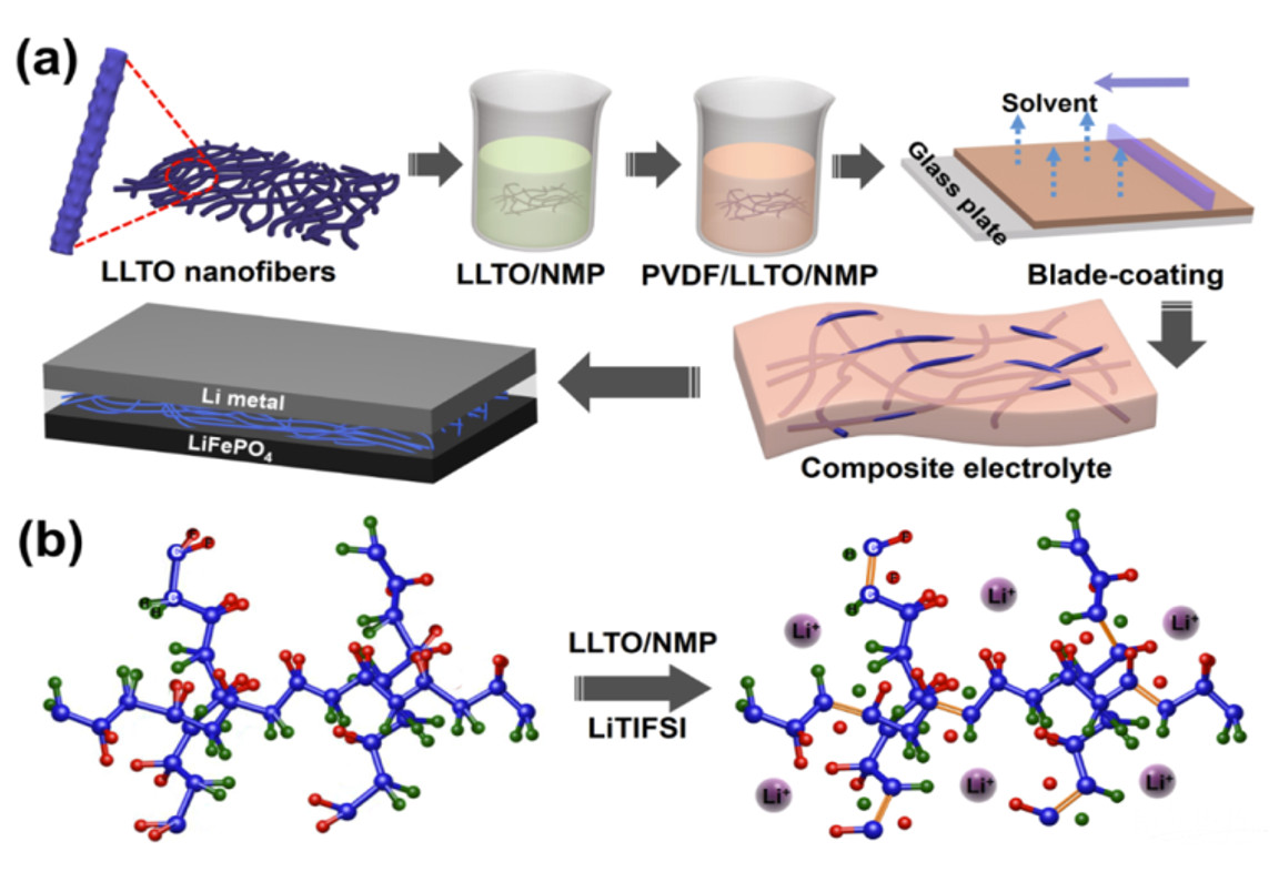 苏庆梅和杜高辉教授针对金属锂具有高的活性,与电解液会发生副反应,在电化学循环中容易损耗,导致较低的库伦效率;且在反复沉积/剥离过程中,锂枝晶生长刺穿隔膜引发电池内部短路、热失控,甚至发生起火爆炸等问题,构筑了无机陶瓷和有机聚合物互嵌的双连续结构复合固态电解质,提高了离子电导率、抑制了锂枝晶的生长、改善了锂金属电池的性能。利用涂覆法室温下构筑了Li0.35La0.55TiO3纳米线填充PVDF复合固态电解质,该复合电解质具有较高的室温离子电导率、较宽的电化学窗口和高的机械性能,相关成果以“Li0.35La0.55TiO3Nanofibers Enhanced Poly(vinylidene fluoride)-Based Composite Polymer Electrolytes for All-Solid-State Batteries”为题发表在期刊ACS Appl. Mater. & Interface(IF=8.758)(https://doi.org/10.1021/acsami.9b14824)上。