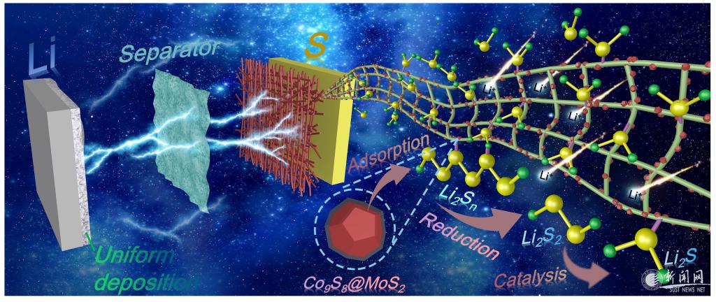 Co9S8@MoS2/CNF用作锂硫电池功能层的示意图