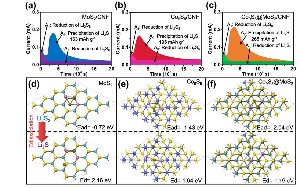 Li2S的成核实验结果及Li2S2在不同功能层结合能和解吸能的DFT计算结果