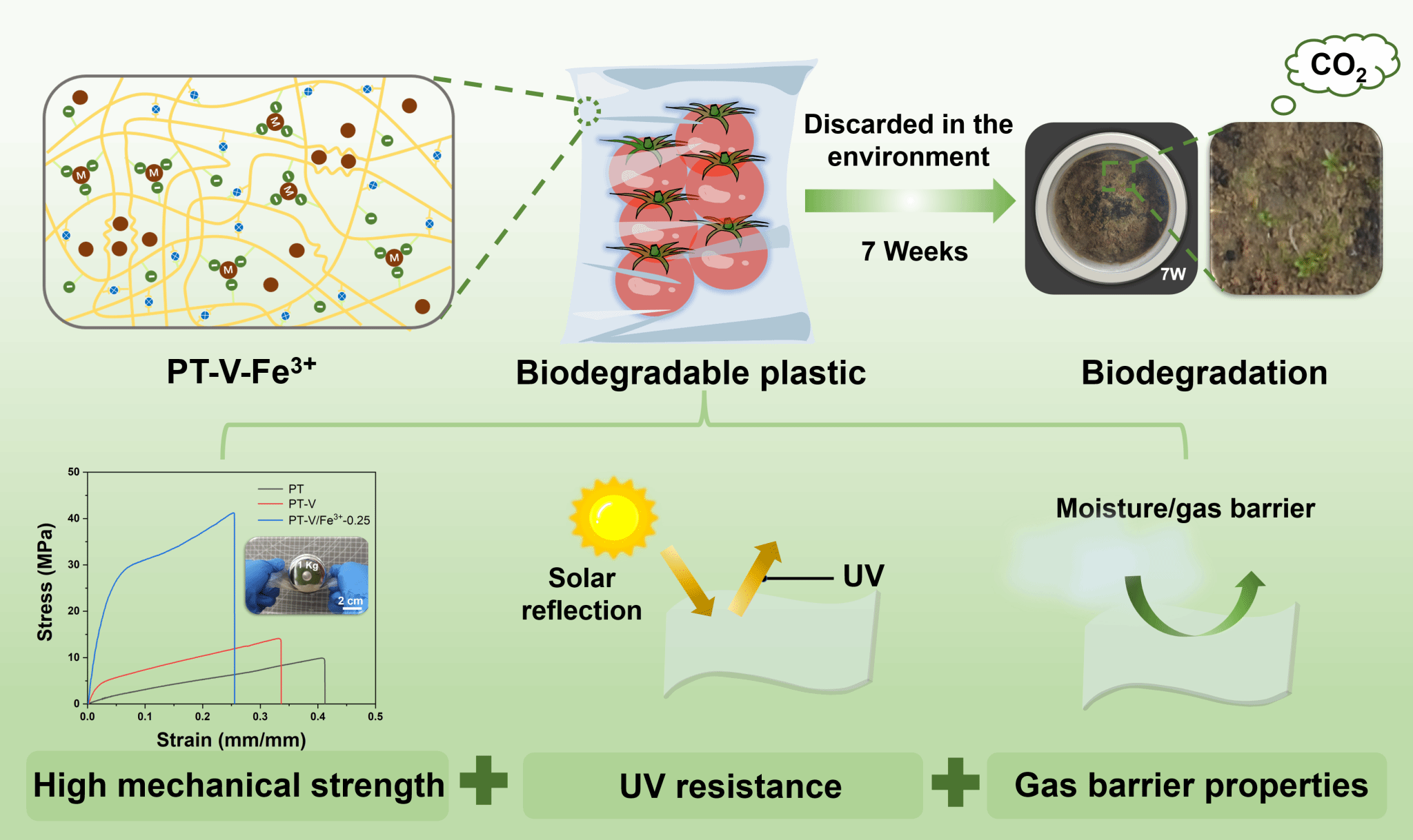 为进一步提高果胶基薄膜的耐水性,强涛涛教授通过酸催化缩醛反应将香兰素接枝到果胶链上,并在果胶基质中引入Fe3+离子成功制备出了具有高强度、可耐水性和生物降解性果胶基塑料薄膜(PT-V/Fe3+)。