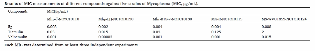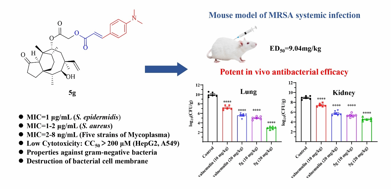 耐药菌株的出现对传统抗生素提出了严峻挑战,凸显了探索新型抗菌药物的迫切性,据国家儿童医学中心、首都医科大学在我国新近流行的支原体肺炎感染中,耐药支原体对大环内酯类药物的耐药率已达到90%,由于四环素类和喹诺酮类药物在儿童和青少年人群中的用药限制,儿童支原体肺炎患者亟需安全有效的抗支原体肺炎药物。梁承远教授联合新疆医科大学药学院李敏团队、盘龙药业设计合成一系列截短侧耳素芳香丙烯酸酯衍生物,并对这些截短侧耳素衍生物的抗菌活性、抗支原体活性进行了评价,多数衍生物对革兰氏阳性菌和革兰氏阴性菌均表现出中等至优异的抗菌活性。其中,化合物5g抗菌活性最强,其MIC值为1~32μg/mL,对临床分离耐药菌株的MIC值为4~64μg/mL。5g对5株支原体表现出优异的活性,MIC值在2至8ng/mL围内,优于已上市药物沃尼妙林(MICs=0.03–2μg/mL)。此外,5g表现出极低的细胞毒性以及扰乱细菌细胞膜的倾向。5g可提高MRSA感染小鼠的存活率,ED50为9.04 mg/kg。这些结果表明5g可进一步开发为抗菌药物、抗支原体药物,用于临床治疗耐药菌感染及支原体感染。该成果发表于《European Journal of Medicinal Chemistry》上,李敏(第一作者)、梁承远教授为文章共同通讯作者,盘龙药业谢晓林、张德柱为文章共同作者。全文链接:https://doi.org/10.1016/j.ejmech.2023.115653。