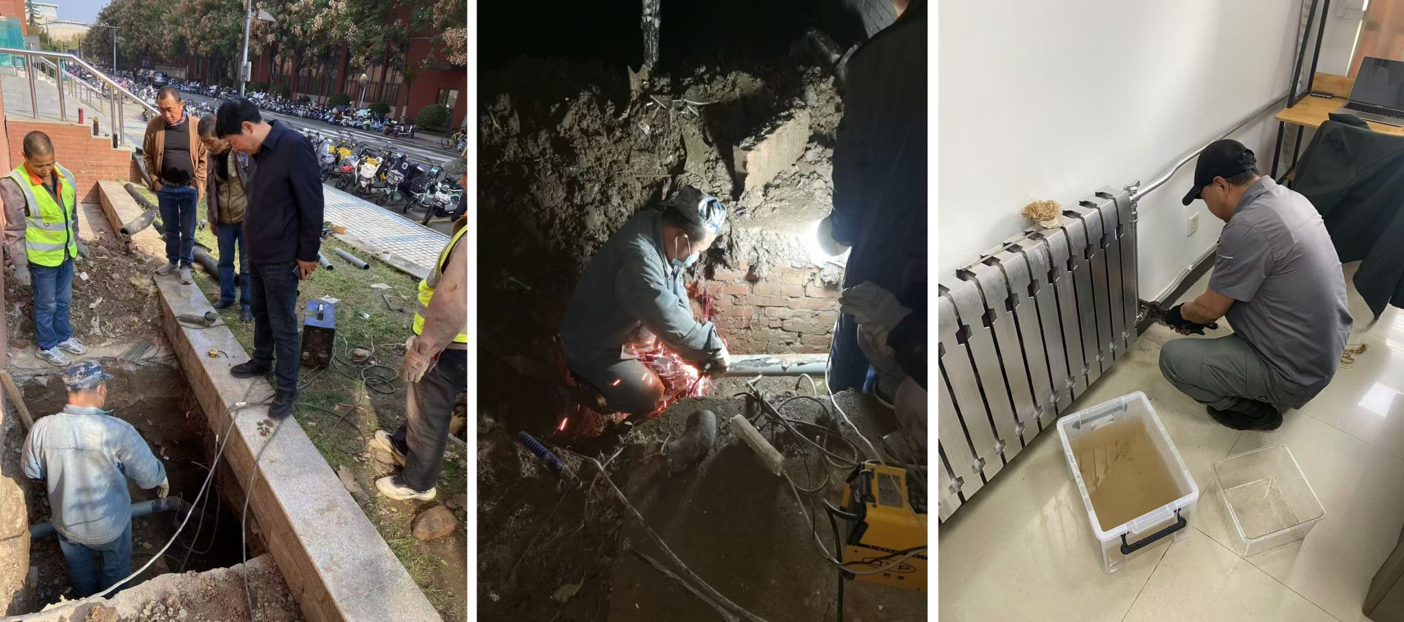 提前打压试水,避免跑冒滴漏。“试水”是供热前对供热设施进行调试的重要环节。后勤集团提前一个月对管网进行注水,发布试水通知。因供热管网直埋深处、管网系统庞大、管道覆盖于硬化路面之下等诸多因素影响,给排查并解决跑冒滴漏问题带来极大挑战。面对困难,集团制定了“动力中心牵头、工程中心跟进、相关科室配合”的工作方式,遵循“随排查、随抢修”原则,对全校管线进行了全面细致的排查。试水期间,成功解决跑冒滴漏300余处,紧急修复教学楼、学生公寓、实训楼等大漏点20余处。供暖前夕,所有抢修工作全部完成。