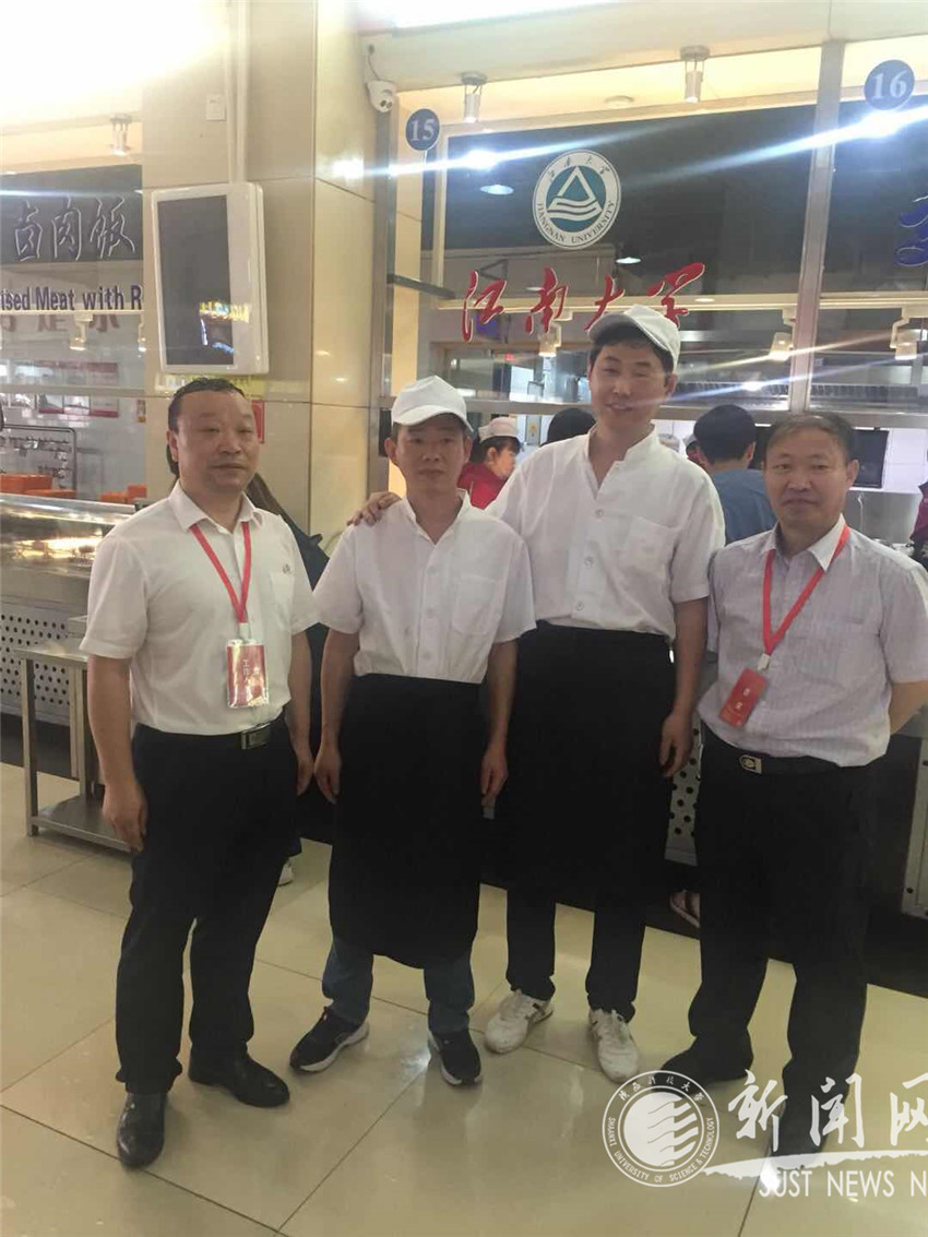 校党委副书记王道安(图左)、江南大学副校长顾正彪慰问来pg电子官网交流的江南大学饮食工作人员