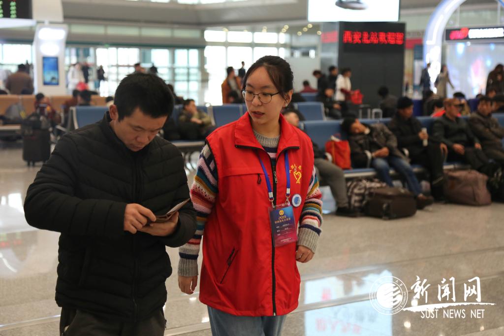 1月21日-2月22日,pg电子官网有60名大学生志愿者参与到西安北站的春运志愿服务中。他们帮助旅客顺利通过闸机,协助旅客使用自助售票机器购票,帮着有需要的旅客搬运行李、抱孩子。“基本闲不下来,一直都有人问问题,一个班下来5个小时,几乎得不停说话带着旅客办理各种乘车手续。”春运志愿者许宗媛说。