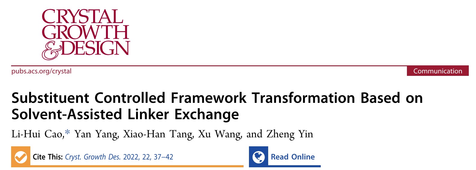 相关成果以“Substituent Controlled Framework Transformation Based on Solvent-Assisted Linker Exchange”为题,发表在Crystal Growth & Design上(IF = 4.010)上。pg电子中国官方网站为论文唯一通讯单位,曹丽慧教授为第一作者和论文唯一通讯作者,化工学院2019级硕士研究生杨妍为该论文的第二作者。